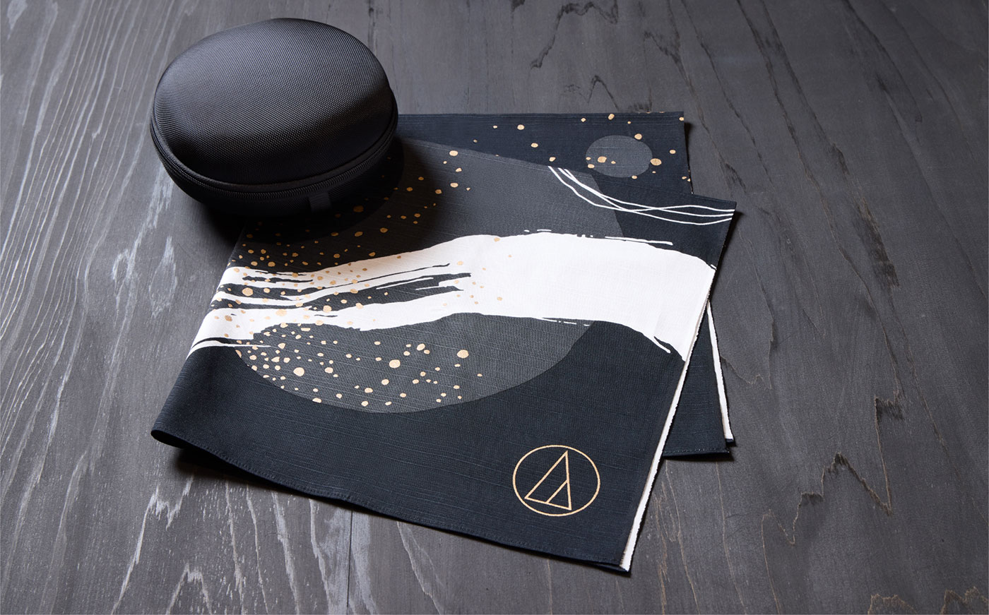 馬場染工場は110年以上の歴史を持つ京都の染色工房。風呂敷は日本文化に根ざした多用途の布で、贈り物を包む際にも使われる美しいアイテムです。『ATH-M50x ENSO』にあわせた手染めによる模様とデザインは、唯一無二の存在となります。