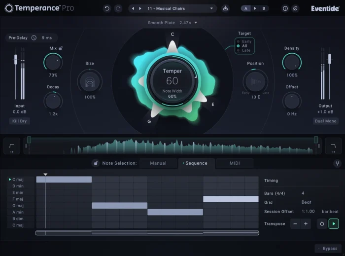 Temperanceはこの新手法の力を活用し、12音のクロマチックスケール上で動作することで空間を音楽的に形成。調和の取れた音響環境と不協和な音響環境の両方を創出します。
