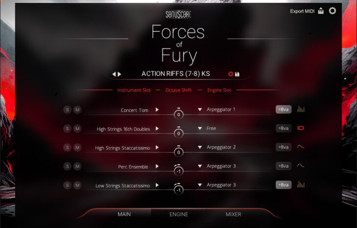 『THE ORCHESTRA』シリーズの核となっている「Ensemble Engine」を搭載しており、最大5つの楽器 / アーティキュレーションをロードして、シンプルなコードから豊かなオーケストレーション・アレンジをリアルタイムに生み出すことができます。『TO – Forces of Fury』に演奏済みのフレーズは収録されておらず、搭載されたアルペジエイターやエンベロープにより数多のフレーズを、アンサンブルを生成します。さらに、1つのプリセットにつきアルペジエイターやエンベロープの設定を最大4種類保持でき、キースイッチで設定を切り替え、演奏を展開させていくことが可能です。また、各楽器 / アーティキュレーション単体のnki も用意されています。