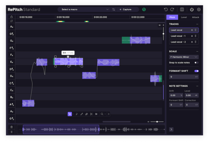 プロに信頼されるボーカル・プロセッシング・プラグインで、正確で自然なサウンドのパフォーマンス・チューニングを。ボーカルをあらゆる音階に瞬時にスナップさせたり、ピッチ、タイミング、ビブラートを瞬時に細かく変更できます。