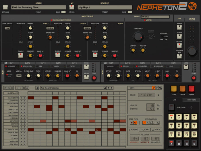 有能なマスター・セクションは、3バンド・コンプレッサーですべてをまとめ、リミッターで出力をコントロールしてパワーを加えることで、ドラム・ラインに最後のパンチを与えます。すぐに使えるマスター・プリセットで、望み通りの結果をすぐに得ることができます。
