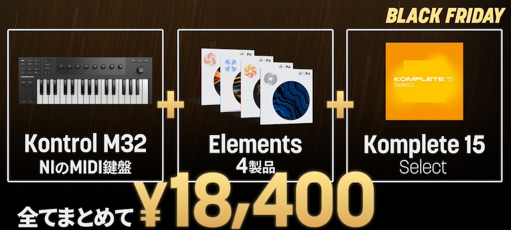 そして、Native Instrumentsの省スペースMIDIキーボードM32/A49/A61を購入すると、iZotopeのElements 4製品がプレゼントされるなど、他のシーズンでは実現できないブラックフライデーならではの圧倒的プライスです。