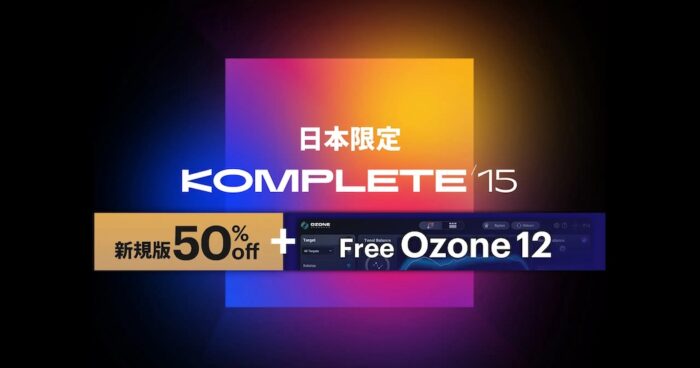 新規でKomplete 15 (Standard以上)を半額購入すると、Ozone 12 Standard(通常39,600円)がプレゼントされます。