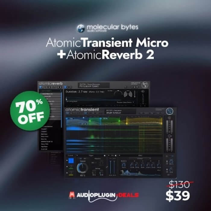 アタック/サスティンの精密なコントロールと革新的なアルゴリズム・リバーブを実現する、Molecular Bytes「Atomic Transient Micro and AtomicReverb 2 Bundle」が70%OFFとなっています。