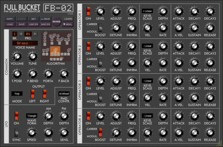4オペレーターFMシンセサイザーYAMAHA FB-01をエミュレートした、Full Bucket Music「FB-02」無償配布開始です。
