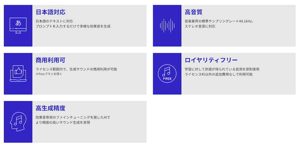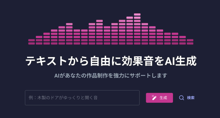 テキストを入力するだけで、高品質かつ商用利用可能な効果音を自由に生成でき、生成パターンのバリエーション生成や、一度に多量の同時生成など、質・量ともにクリエイティブな制作活動を支える機能を搭載。
