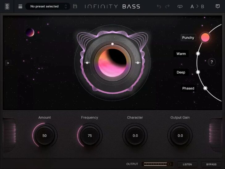 Infinity Bassは、ベースを強調し不足部分を補完する、強力なサウンドシェイパーです。4つのベースシェイピングモード、直感的なコントロール群、そしてインスピレーションを与える応答性の高いビジュアライザーを搭載し、トラックの低音要素を完全に制御できます。