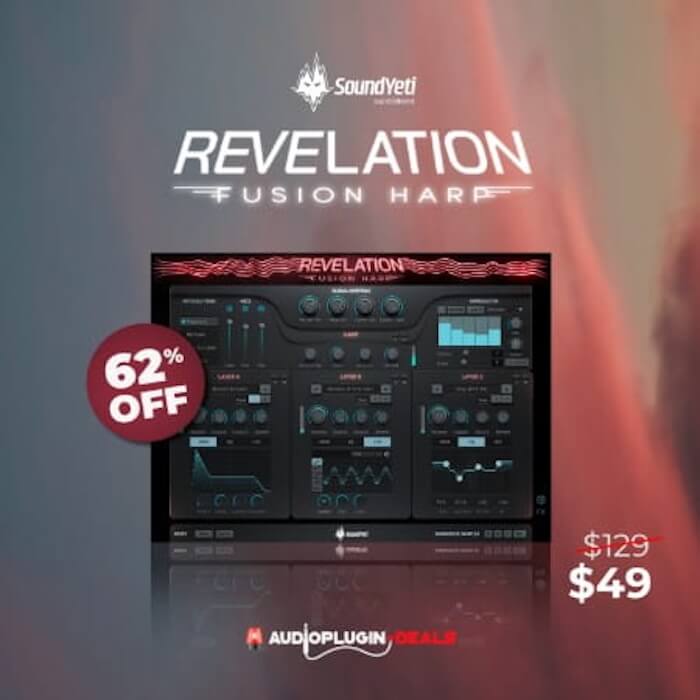 サンプリングされたオーケストラ・ペダル・ハープとパワフルなシンセ・エンジンを融合した、Sound Yeti「Revelation Fusion Harp」が62%OFFとなっています。
