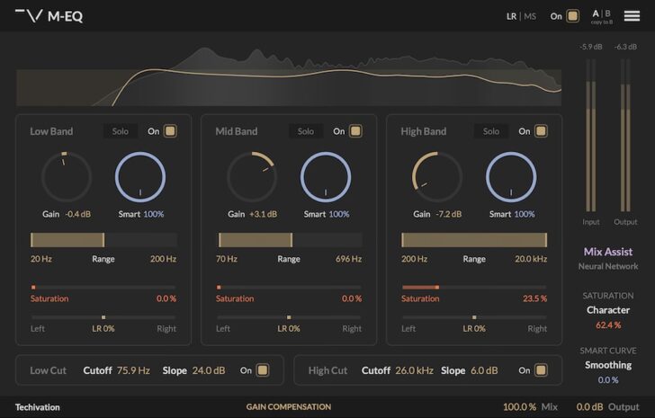 Techivation M-EQは、3つのインテリジェントなSmart Curvesを搭載したリニアフェイズイコライザーです。これらのカーブはオーディオ信号に応じて形状を動的に適応させます。