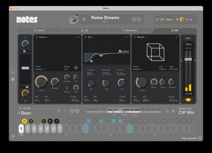 Notesのプリセットは、音色とコードセットが最初から組み合わされた状態で用意されています。サウンドを切り替えるだけで、楽曲の雰囲気やジャンル感が一気に変化。「この音に合うコードを探す」そんな作業を省き、制作に集中できます。