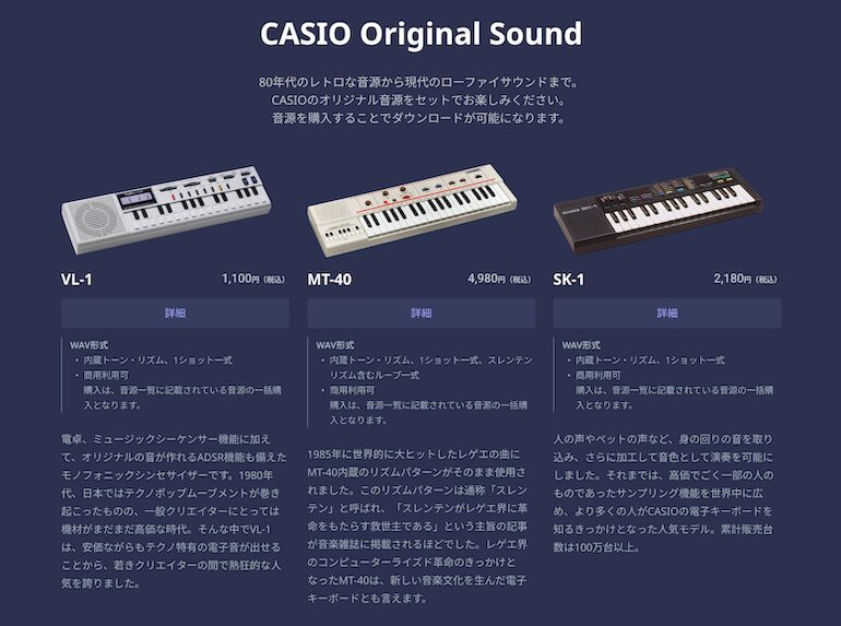 電卓、ミュージックシーケンサー搭載の電子キーボードVL-1、世界中で多くの人に愛されたサンプリングキーボードSK-1、レゲエ界に革命を起こしたリズムパターンの「スレンテン」で知られる電子キーボードMT40、各モデルの内蔵リズムやトーンが一式で手に入れることができるようになりました。