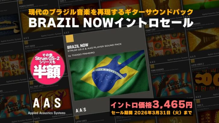 A|A|Sでは、Strum GS-2シリーズが今だけ50%オフとなる、新作サウンドパック「Brazil Now」発売記念イントロセールを開催中です。合わせてチェックしてみてください。