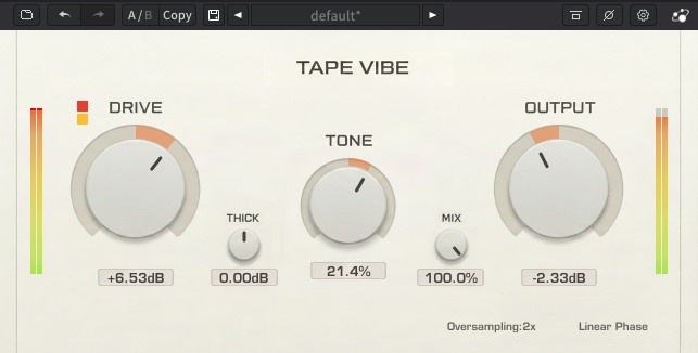 Tape Vibeは、現代の楽曲制作にヴィンテージ・テープのキャラクターを加えるというシンプルな目的で開発された、マイルドからミディアムまでのサチュレーターです。トランジェントを保ち、ミックスの明瞭さを維持しながら、アナログを彷彿とさせる豊かな倍音をトラックにもたらします。