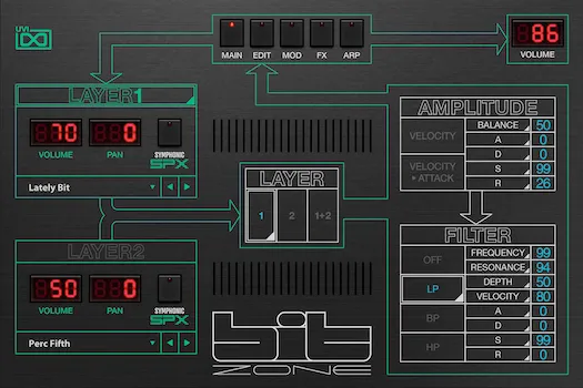 Bit Zoneのインターフェースデザインは、ハードウェアのデザインコンセプトを忠実に再現しており、オシレーター、エンベロープ、マルチモードフィルター、LFO、ステップモジュレーター、デュアルアルペジエーター、そしてEQ、ドライブ、Thorus、アンサンブル、Phasor、ディレイ、Sparkverbを含むエフェクトセクションといったデュアルレイヤーのサウンドを編集する際、このユニークなスタイルの楽器ならではの感触を味わえます。