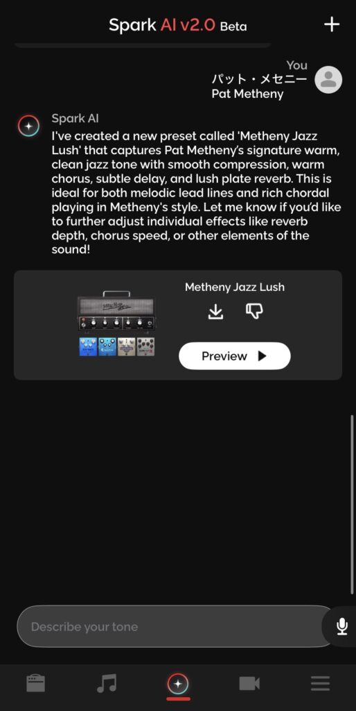 パット・メセニーのサウンドに近いセッティングが欲しかったので、試しに写真のように「パット・メセニー」と入力してAIに送ると、イメージに近しいプリセットを提案してくれました。